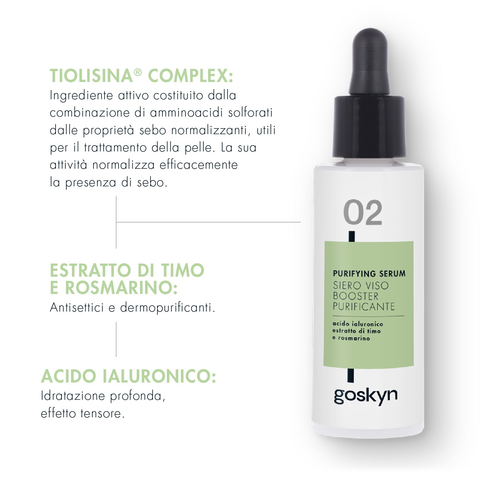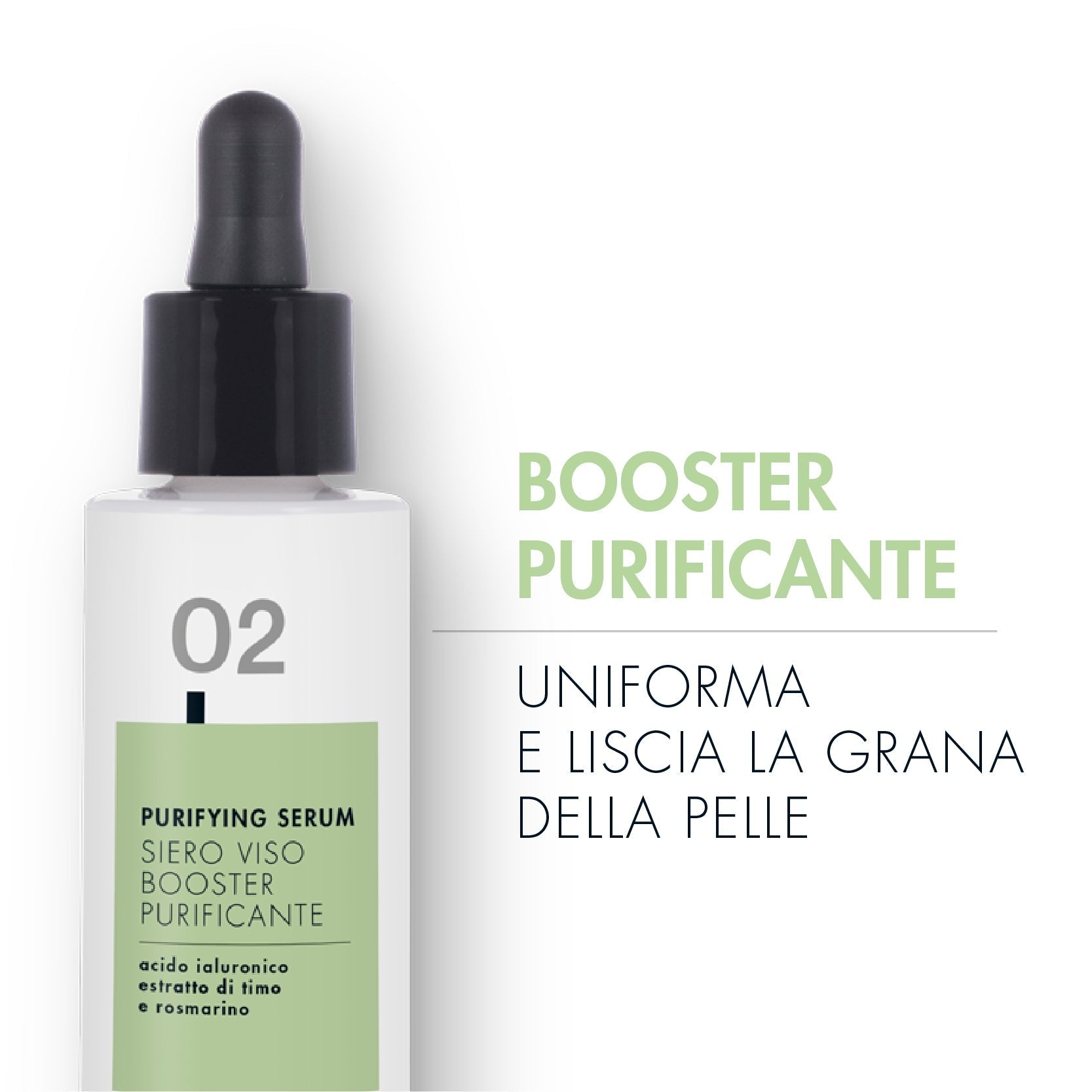 Concentrato intensivo ad azione purificante e uniformante. Ideale per la pelle grassa ed impura e per contrastare l’invecchiamento della pelle e contrastare punti neri e acne. Rende uniforme e liscia la grana della pelle, grazie all’azione sinergica di Tiolisina® ingrediente brevettato a base amminoacidi solforati, che assorbono sebo in eccesso ed impurità, e di Niacinamide e Acido Jaluronico con estratto di Timo e Rosmarino, igredienti naturali che regolano la secrezione sebacea.
